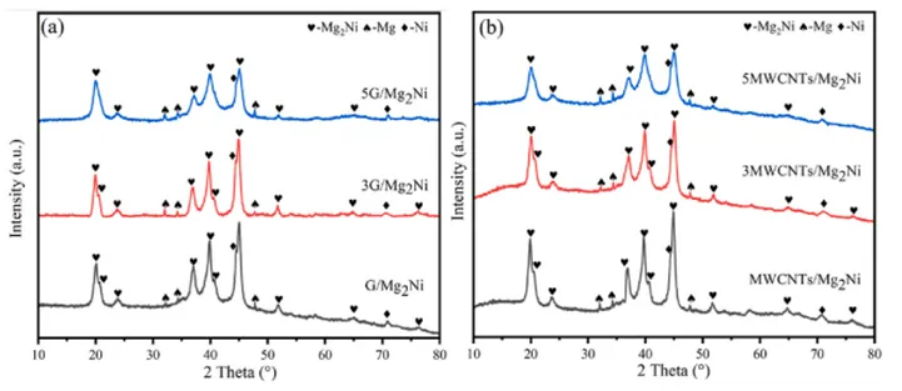 首先稱取45.3g鎂粉、54.7g鎳粉和3g硬脂酸(用作過程控制劑)。為了平衡Mg在球磨過程中的損失,額外添加4wt %的Mg,然后均勻混合并放入高能球磨機中。為了防止球磨過程中的氧化,在氬氣保護氣氛下進行了研磨。球料比為15∶1,采用3mm不銹鋼球,球磨機以900r/min和1000r/min的速度交替運行,研磨時間為5h。在球磨過程中使用循環(huán)冷卻方式,使球磨腔溫度維持在35℃左右。使用石墨烯和MWCNTs對Mg2Ni合金進行復合改性。