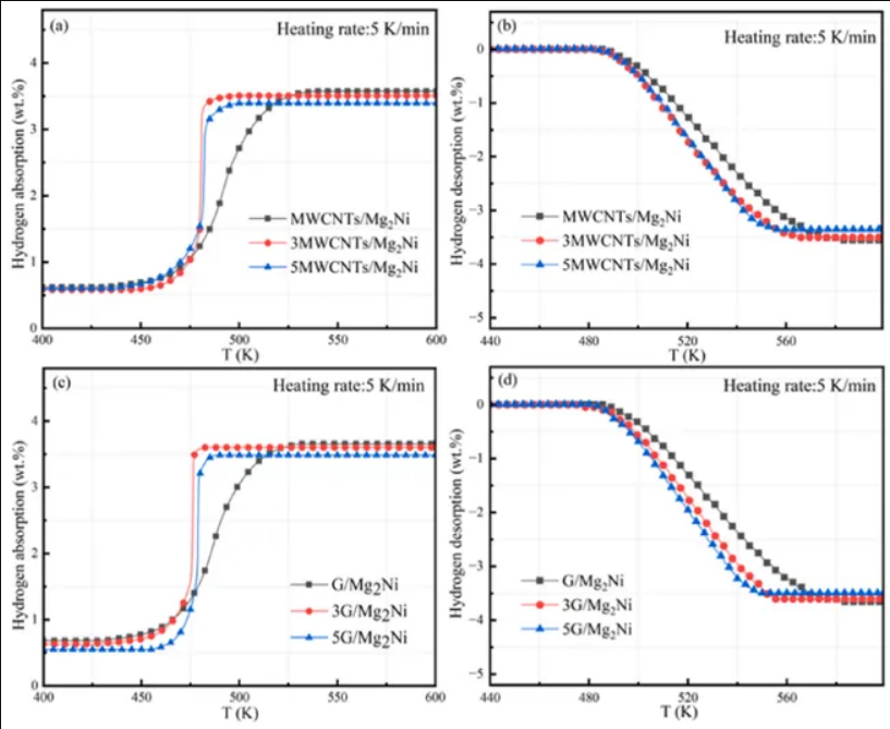 當添加量為3wt%時表現(xiàn)出最佳的吸氫性能,在475K的溫度下,在200s內迅速達到吸氫的飽和狀態(tài),在達到吸收溫度后表現(xiàn)出穩(wěn)健的吸氫動力學。隨著5wt%MWCNTs的引入,放氫飽和溫度為545K,放氫速率也略有上升。與MWCNTs樣品相比,3G/Mg2Ni在476K左右表現(xiàn)出更冷的吸氫量,具有更強的動力學特性,可以在150s內快速達到吸氫飽和。